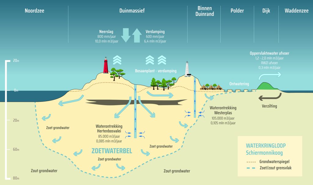 Zoet water is iets lichter dan zout water. Hierdoor ‘drijft’ het zoete water op het dieper gelegen zoute water. Schiermonnikoog is immers een eiland dat helemaal is omringd door de zee. Als je diep genoeg graaft, kom je vanzelf bij het zoute zeewater terecht. Maar daarbovenop bevindt zich dus de zoetwaterbel. Alleen aan de randen van de zoetwaterbel is het water brak, omdat het daar vermengd raakt met het omringende zoute zeewater.